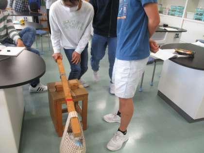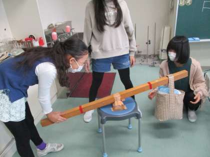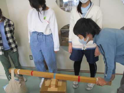 理科の学習で、できるだけ小さな力で重いものを持ち上げるには、どうしたらよいか実験をしました。てこの原理を理解し、みんなで試してみました。「おもりを手前にしてみよう」「もっと支点に近いところを押したらとうなるかな」などと言いながら取り組みました。軽く持ち上がったときには、「すごい」という歓声が上がりました。
