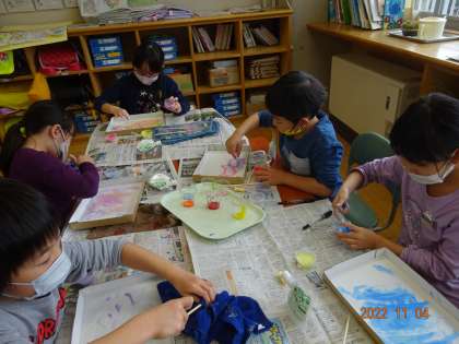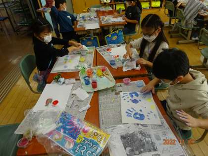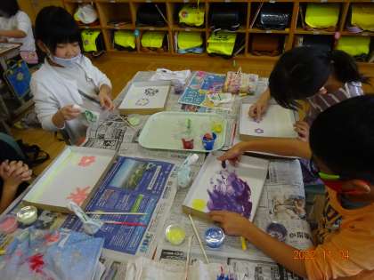 ひんやりとした触感を楽しみながら手の平を大胆に動かしたり、細かく絵の具を垂らしたりして、工夫して仕上げることができました。
