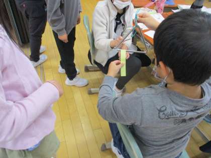 理科の学習で、音が出るときに物はふるえているのかを調べました。音を出したときの物の様子や手でにぎるとどうなるかを調べたり、音の大小によってどう変化するのかを観察しました。子供たちは、トライアングルの音を大きくしたり小さくしたりするとふるえ方が変わることに気付いていました。