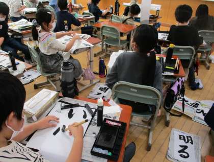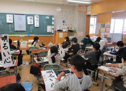 1月の書き初め大会に向けて、書写の時間に書き初めの練習をしました。毛筆での書き初めに初挑戦する3年生。今年、書く字は「明るい心」です。まずは、半紙2枚を使って2文字ずつ練習し、その後、書き初め用紙に書きました。これから、練習を重ねていく予定です。