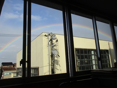 寒い日が続いていますが、今日の掃除時間の後に子供たちの様子が賑やかでした。理由は・・・北の空にかかる大きな虹です。すぐに消えてしまいましたが、とてもきれいな虹に出会いました。