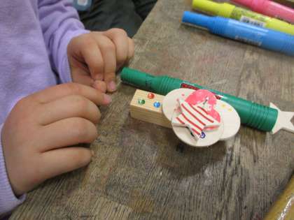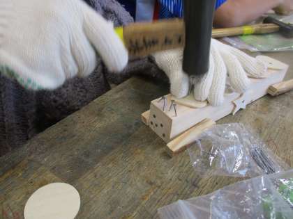 図画工作科では、木材に釘打ちをして制作をしています。金槌で釘打ちすることにも慣れてきた様子。釘打ちを楽しみながら、木材の組み合わせや釘の打ち方などを工夫しています。