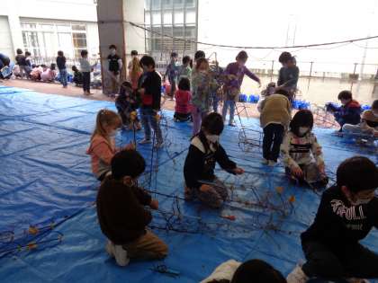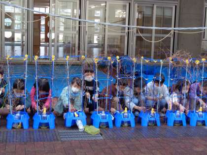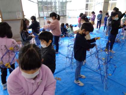 アサガオのつるを使って、リースづくりをしました。一番の難関は、巻き付いたつるを支柱から外す作業です。子供たちは、難しい作業でも一生懸命に最後まで丁寧に外していました。終わった子供たちは友達の手伝いも進んで行い、難しい作業もみんなで協力し合う姿が見られました。