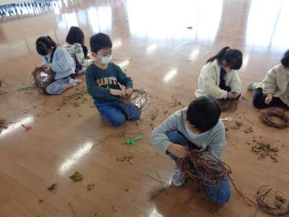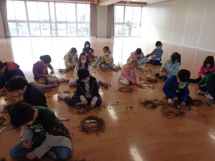 いよいよ、つるを輪にする作業です。アサガオのつるだけではボリュームが足りないだろうと、前年度に体験した2年生から、サツマイモのつるをプレゼントされました。おかげで、よりリースらしいボリュームが出ました。子供たちは、思い思いの大きさの輪に仕上げました。