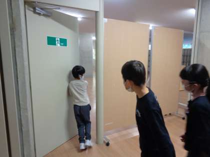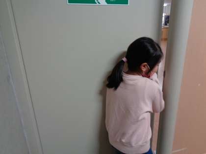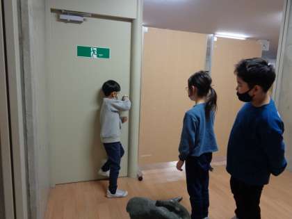 防火扉を通る訓練を行いました。子供たちにとっては少し重めの扉です。半身を使って押しながら開ける動作を練習しました。