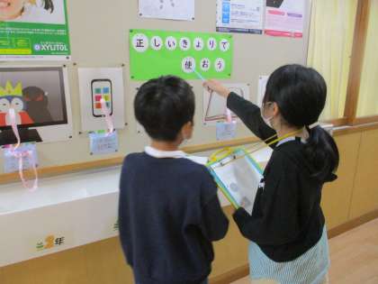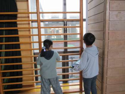 外国語活動で、いろいろな形の英語表現を学んでいる3年生。今日の学習では、学校内を巡って形探しをしました。