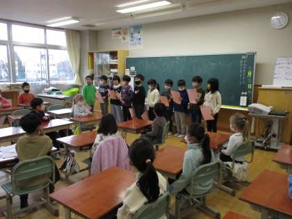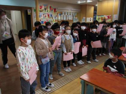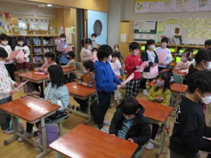 2年生は生活科の学習で動くおもちゃを作りました。「1年生さんを招待したい」という子供たちの思いを受け招待状を書きました。自分たちの作ったおもちゃで楽しんでもらいたいと気持ちを込めて、渡しに行きました。