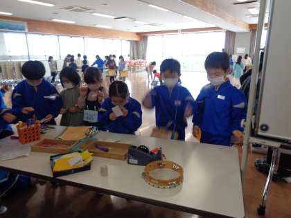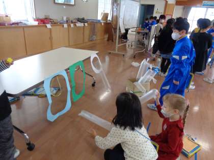 ゴムを使った動く車や勢いよく跳ぶカップ、飛び跳ねる紙等、様々なおもちゃがありました。どれもとても楽しむことができたようです。「2年生になったら、自分たちも同じようにしたい」という思いをもつことにつながりました。