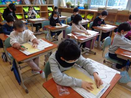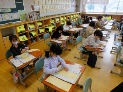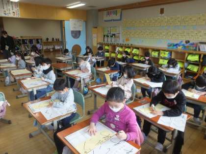 緊張した面持ちの中、書き初め大会が行われました。冬休みにたくさん練習した成果を出そうと何度もお手本を指でなぞる姿、気持ちを落ち着けようと書き始めまで用紙を見つめる姿等、それぞれが様々な思いで臨んでいました。