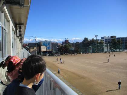 今日はすっきりと晴れ、いいお天気でした。お昼休みには、グラウンドで元気に遊ぶ子供たちがいっぱい。また、教室の窓からは美しい立山連峰が見えました。