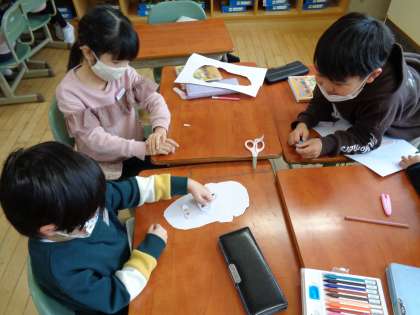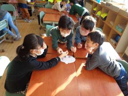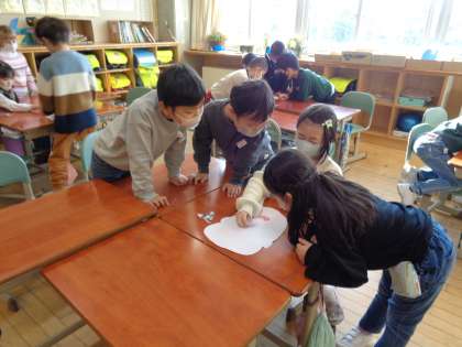 昔の遊びについて話し合い、その中の一つ、福笑いに挑戦してみました。グループで顔やパーツを作り、目をつむってしました。周りの友達から「もうちょっと右」「そこそこ」などと声をかけてもらいながら、目を開けて出来上がりに大笑いする子供たち。昔の遊びの楽しさを感じることができたようです。