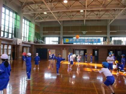 体育科では、ネット型ゲームの学習としてキャッチソフトバレーボールに取り組んでいます。相手がとりやすいようにボールを高く上げること、ボールを落とさないようにキャッチすることに気をつけながら練習しています。