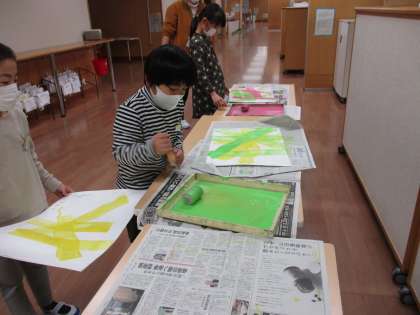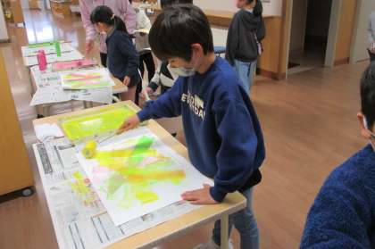 図画工作科の時間では、「ステンシルローラー版画」の学習に取り組んでいます。今日は台紙に枠を貼り、色を付けました。最初の色付けは、黄色やピンク、黄緑などの薄い色を使いました。子供たちは久しぶりのローラー版画に、「きれいな色がついて楽しい」「少し重なったところの色がきれい」と楽しく活動をしていました。