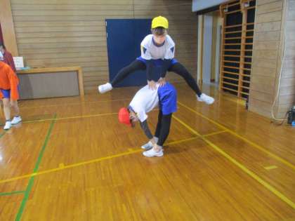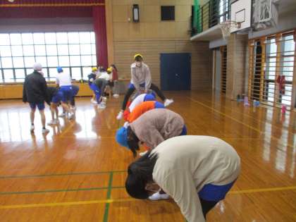 体育の時間、準備運動のひとつとして、馬跳びをしています。ペアやグループで、交代で跳び合いました。