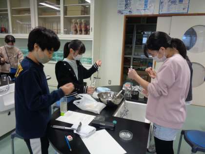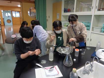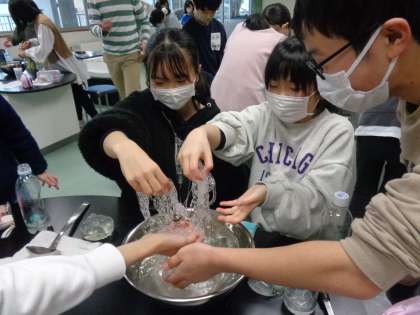 3年生のクラブ見学がありました。科学・工作クラブでは「つかめる水」の実験を行いました。水溶液の中で、ゲル状の液体が丸く固形化していく変化に驚いたり、ゼリーのようにプルプルになった物質をつかみ出して感触を楽しんだりしました。