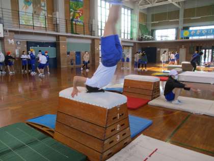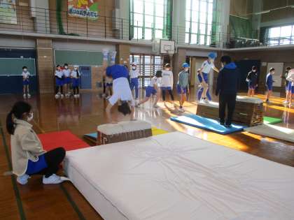 体育の時間は、跳び箱運動をしています。台上前転の発展技として、頭とびはねにも挑戦。技ができるように、何回もトライしています。