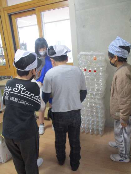 使い終わったペットボトルを積み上げてタワーにし、キャップを付けて「150」の数字を作ります。子供たちは、全校に「いらなくなったペットボトルをもってきてください」と呼びかけたり、来てくれた人にキャップを付ける場所を説明したりしていました。