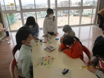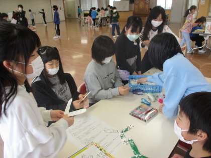 牛乳パックを細長く切り、それを三方向に向けて合わせて留めることで、手作りのブーメランの作りました。4年生は参加してくれた西っ子に丁寧に作り方を教え、その場で飛ばして遊んでもらいました。上手に戻ってくると歓声が上がるなど、楽しいワークショップとなっていました。