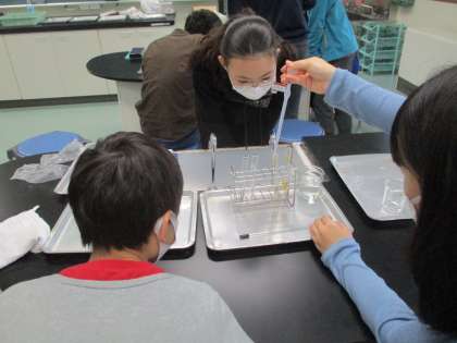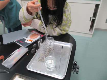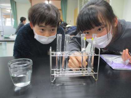 理科の時間に「水溶液に金属を変化させるものがあるのか」を調べました。酸性の水溶液にアルミニウムとスチールウールを入れて、変化を見ました。泡を出したり、少しずつ小さくなっていく金属をじっくりと見たりしています。