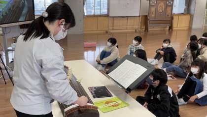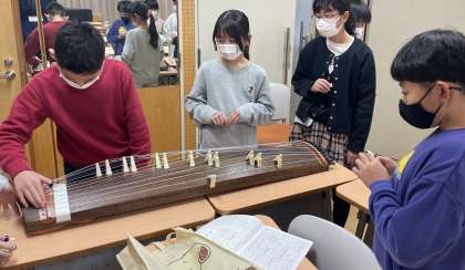 音楽科の授業で、伝統的な和楽器について体験的に学びました。最初に、子供たちは「千本桜」や「砧」を鑑賞したり、楽器や楽譜の仕組みについて学んだりしました。その後の体験コーナーでは、「さくらさくら」の一節を演奏しました。和楽器をより身近に感じられたようで、お琴ならではの美しい響きを味わい楽しんでいました。