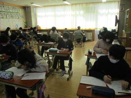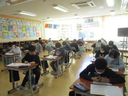 学年末のテストが始まりました。算数の問題を真剣に解いています。