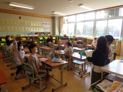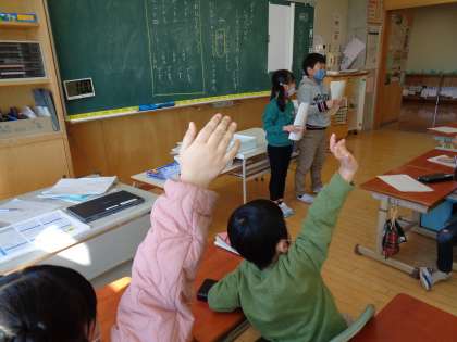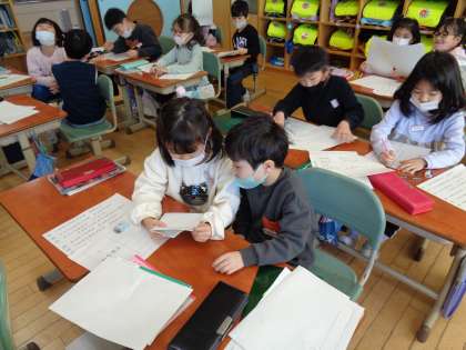 二人で、問題をつくる学習を行いました。答えになるものやヒントになることを出し合い、選んだヒントをどんな順で出していけばよいかを考えました。どのペアも、ヒントが進むにつれて答えに近付いていくように問題を出していました。