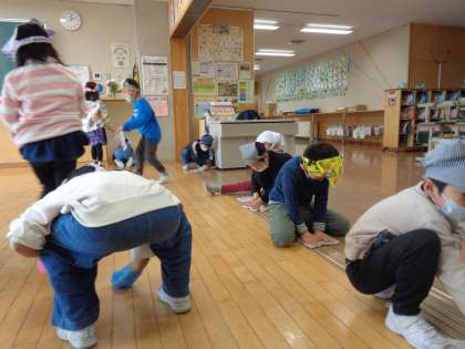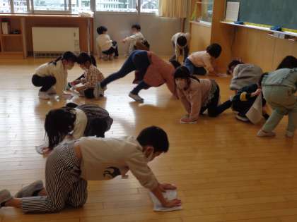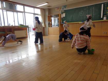 放課後にワックスがけをするため、全員で教室を掃除しました。机や配膳台を廊下に出し、床を水拭きしました。1年間お世話になった教室に感謝の気持ちを込めて、一生懸命雑巾がけをしたり、汚れている部分を見つけて友達と協力してこすったりする姿が見られました。