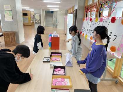自由参加のお祝いメッセージコーナーでは、熱心にお礼の言葉を書く子どもたちがいました。昼の放送では、在校生と卒業生が温かなメッセージを述べました。また、5年生から卒業生にインタビューする時間も設け、委員会活動や縦割り班活動等の心構えやポイントについて、たくさんのアドバイスをもらうことができました。