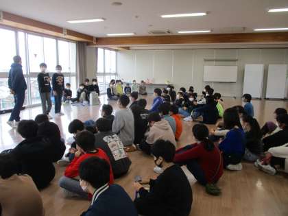 卒業プロジェクトのひとつ、異学年VS6年生集会も最後になり、5年生と縄跳び対決をしました。時間を競い、接戦の末、6年生が勝利しました。最後は、6年生の気持ちを代表の言葉で伝え、集会を終えました。