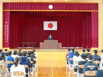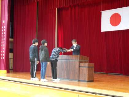 修了式を行い、6年代表児童が通知表を受け取りました。式では、校長先生から大切にしてほしい2つのことについて話をしていただきました。子供たちは、これからの生活に活かそうと目と耳と心で聞いていました。