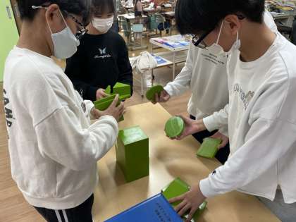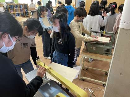 左から理科「電流が生み出す力」、図工「糸のこスイスイ」、算数「角柱と円柱」の授業風景です。