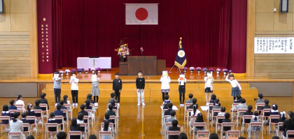 翌日の入学式は、感染症対策もあって、今年度も在校生は6年生のみ参加しました。式では、お祝いの言葉と校歌の披露が主な役目です。式の直前までしっかりと練習し、新1年生のことを思いやりながら、立派に大役を務めることができました。