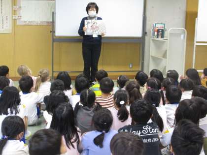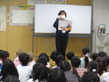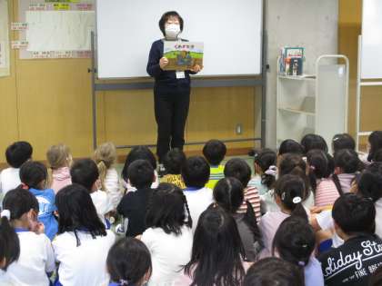 図書館司書による、図書館オリエンテーションがありました。紙芝居を見たり、図鑑の見方を教えてもらったりした後、今年度も、図書室の本の貸し出しが始まりました。