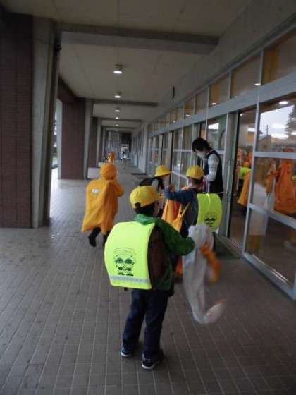 左:1年生 合羽を着て登校しました。担任の先生が玄関で迎えてくださっています。