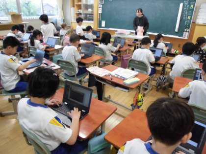 中央:2年生 端末を使って自分のペースで学習を進めています。