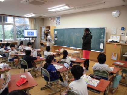 右:3年生 初めてのALTとの外国語活動。ネイティブな英語に興味津々です。