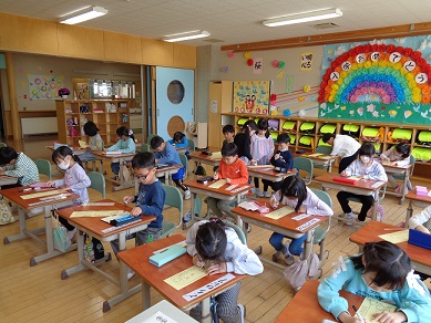正しい鉛筆の持ち方、書く姿勢を学習しました。その後、「小学生になって初めて書く自分の名前」を書きました。