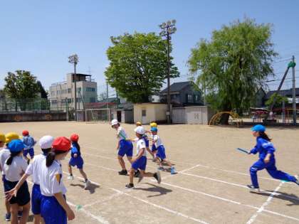 体育では、リレーの練習をしています。バトンパスやリードの仕方を身に付けて、団のタイムを縮めようと頑張っています。