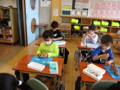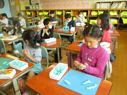 粘土をにぎってできる形から想像しながら、作品をつくる学習をしました。これまでの粘土をこねたり丸めたり、伸ばしたりといった作業はせず、握ったりひねりちぎったりする扱い方で、子供たちは最初、とまどっていましたが、面白さを感じ取ったり、できた形から閃いたりと創作活動に取り組みました。