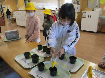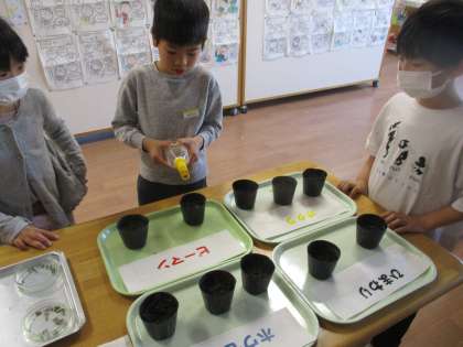 理科の学習で、植物の成長について学習しています。たねをまいたポットに水やりをして、芽が出てくるのを楽しみにしています。