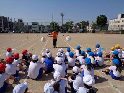 4年生の団体競技、台風の目の練習を行いました。3年生の時とは違った要素を取り入れたり、3年生と協力する場面があることを伝えたりすると、子供達は、「やってやるぞ」と燃えていました。