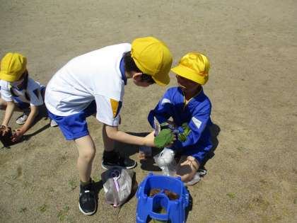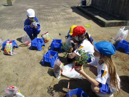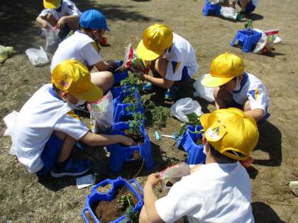 野菜の苗を植えました。次は、支柱を立てたり、肥料をあげたり、病気・害虫対策をしたりなど、収穫までに必要なことを、自分たちで気付き、調べていくように学習をすすめていきます。