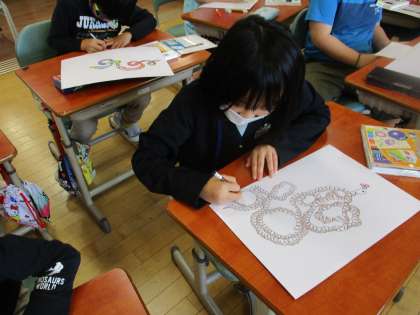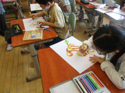 図工の時間に「長い長いへび」の絵を描きました。くねくね曲がったへびを画用紙にいっぱいに描き、色鉛筆で模様をカラフルに彩りました。それぞれのイメージに合わせ、バラエティに富んだへびの絵が仕上がりました。