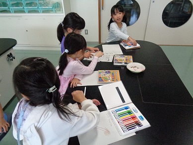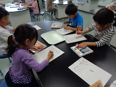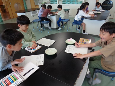 1年生の花壇で育てる植物の種を観察をしました。色や形、大きさなどをよく見てカードに記録しました。