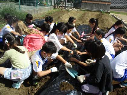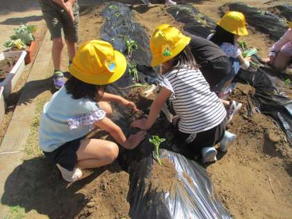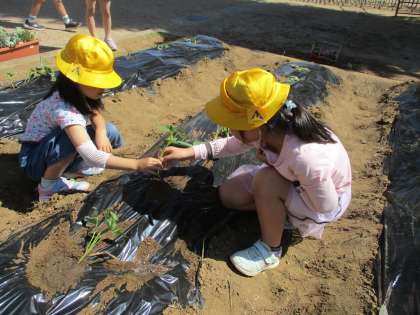 学校の畑に、2人1組でサツマイモの苗植えをしました。子供たちは、初めて見るサツマイモの苗に驚きながら、秋のサツマイモ掘りを楽しみに、寝かせるように優しく植えました。1人1つ育てている野菜の苗とあわせて、よく観察したりお世話をしたりして、大切に育てていきます。