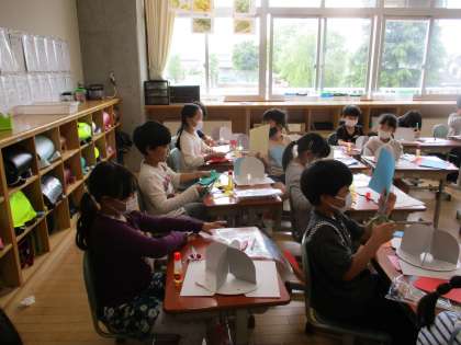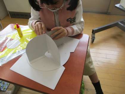 図工の時間に「くるくるらんど」に取り組んでいます。今日は、土台づくりです。台紙で仕切りをし、場面をつくりました。どんな世界ができあがるのか楽しみです。