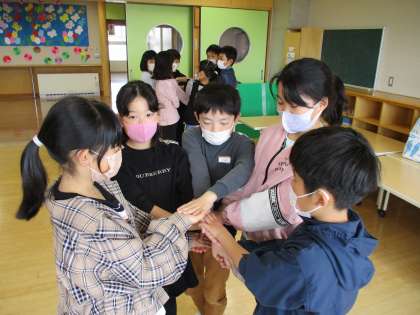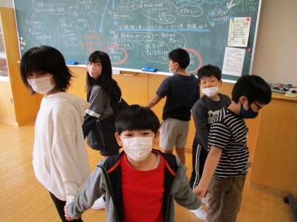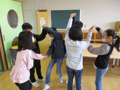 「人間知恵の輪」の様子です。絡み合った腕を協力してほどいていきました。