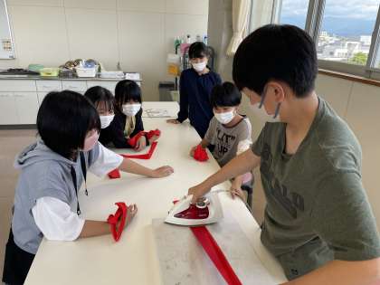 写真右:家庭科の学習の一環で、応援合戦で使ったハチマキを洗濯し、アイロンがけをしました。