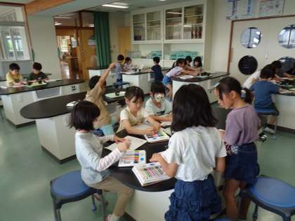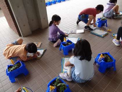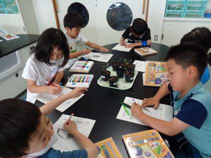 あさがおや草花の芽が出ました。みんなで様子を観察して、気付いたことや思ったことはっけんカードに記録しました。