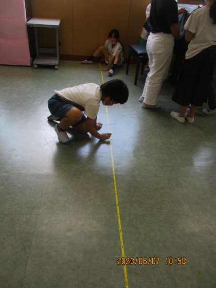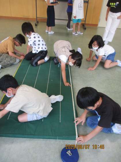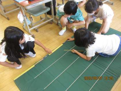 算数科「長いものの長さのはかり方と表し方」の学習では、長いマットのはかり方を考えました。「ものさしでは、ずれてしっかりはかれないなぁ」「ものさしがたくさん必要でたいへん」と子供たちは感じていました。そこで、巻き尺を使うと便利であることを知り、巻き尺の特徴を考えながら、グループで協力してはかりました。